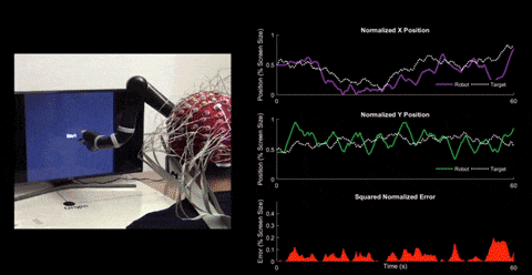 看,这的确是一个巨大的突破:通过脑机接口,用户可以用想象来控制机械臂,让它连续跟踪随机运动的计算机光标,学习效果比以前提高了近60%,学习成绩提高了5倍以上。