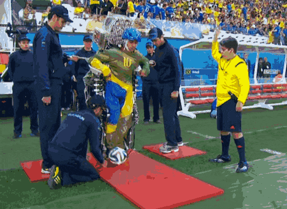 2014年巴西世界杯开幕式,瘫痪的青年利亚诺·平托就是穿了这样庞大、笨重的外骨骼,通过脑机接口踢出了当年世界杯的第一球。