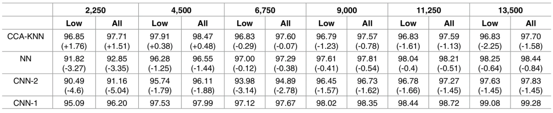 CNN-1在每一个数据量上都优于其他神经网络。然而,CCA-KNN在少于4500个训练数据样本的情况下表现出更好的分类性能。