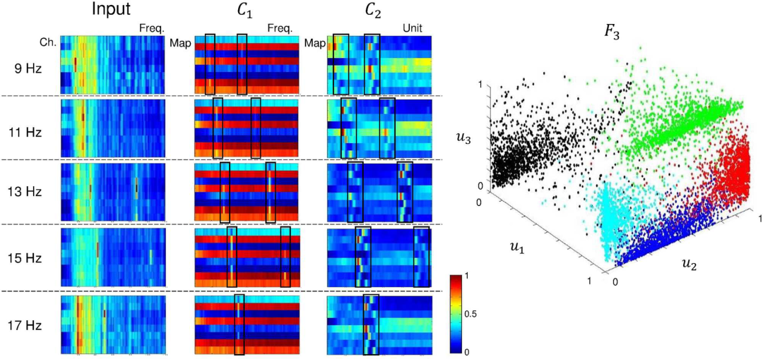 下图为使用动态SSVEP的受试者S1的CNN-2的特征表示。使用动态SSVEP数据表示CNN-2中每一层的平均特征。在F3层中,蓝色为9 Hz;红色,11 Hz;绿色,13 Hz;黑色,15 Hz;青色,17 Hz。