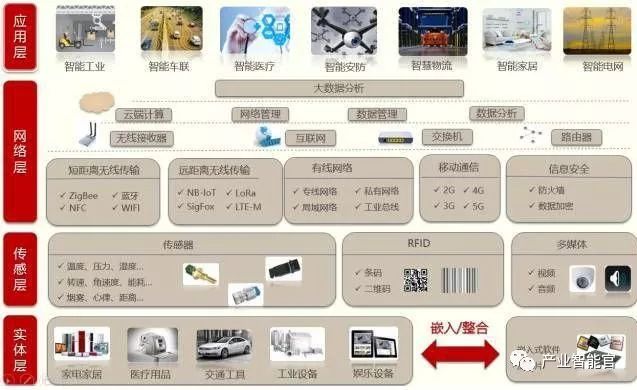 工业物联网体系架构可分为四层,实体层包括各类智能产品及嵌入式软件和芯片等;传感层则是物联网的皮肤和五官,用于识别物体,采集信息,包括条码、二维码标签和读卡器、RFID标签和读写器、摄像头、GPS等;网络层是物联网的神经中枢和大脑,用于信息传递和处理,包括通信与互联网的融合网络、网络管理中心和信息处理中心等;应用层是物联网的“社会分工”,即与行业专业技术及需求实现深度融合,最终实现行业智能化。在物联网各层之间,信息不是单向传递的,也有交互、控制等,所传递的信息多种多样,这其中关键是物品的信息,包括在特定应用系统范围内能唯一标识物品的识别码和物品的静态与动态信息。