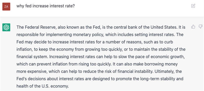 首先一句话介绍美联储是什么机构。 第二句话指出设定利率是美联储的责任之一。 然后列出几个生息的理由,诸如抑制通胀,防止经济过热,维持金融系统稳定性。这段的文字内容上稍有重复,可能是从不同来源总结的。 最后还来了个总结:美联储的利率政策是为了美国经济的长期稳定性和健康。